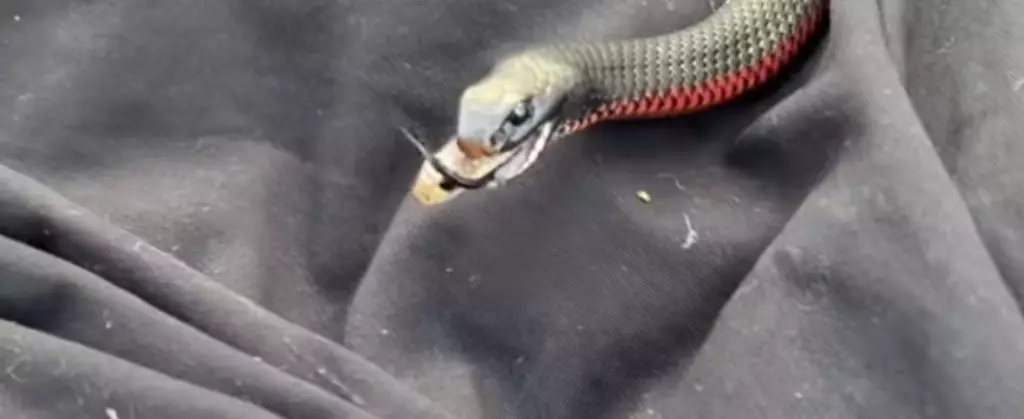 據澳媒《9 News》報導,來自澳洲的捕蛇專家米切爾(Mitchell Thorburn),日前來到位於黃金海岸(Gold Coast)的客戶家作業,在其花園草地上發現一條身長不到1米、體型嬌小的赤腹伊澳蛇(Red-Bellied Black Snake)。