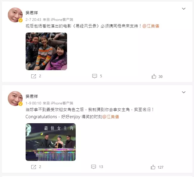 吳君祥之前也有發文祝賀江美儀成為視后。