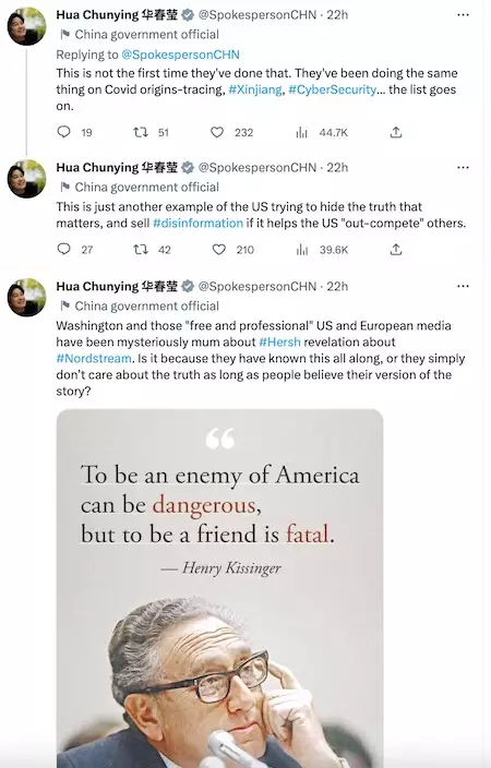 華春瑩2月10日下午在twitter上發文,抨擊美國、歐洲媒體對知名調查記者西摩·赫什的這一爆料保持「神秘的沉默」,推文的配圖是美國前國務卿基辛格的一句名言:「做美國的敵人是危險的,而做美國的盟友則是致命的」。