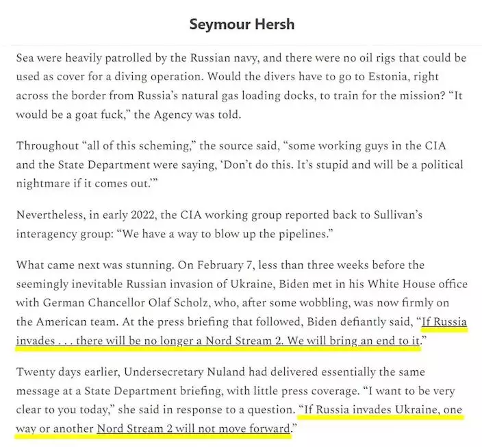 截圖內容顯示,在去年2月7日、也就是距俄烏衝突爆發不到三周,拜登曾在白宮會見德國總理朔爾茨。隨後的新聞發佈會上,拜登挑釁稱,「如果俄羅斯入侵......『北溪-2』將不再存在。我們會結束這一切的。」此外,在拜登這一表態大概一個月前,美國副國務卿紐蘭在國務院的一次新聞發佈會上也傳遞了類似信息,在回答一個問題時,她聲稱,「我今天想跟你們說清楚...... 如果俄羅斯入侵烏克蘭,『北溪- 2』項目無論如何都不會向前推進了。」赫什在文中稱,而紐蘭這一表態也沒得到太多報道。