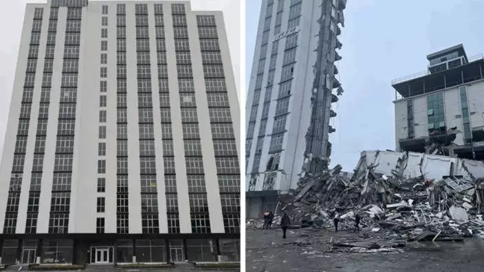 該3棟建築物都是在地震一刻土崩瓦解,畫面震驚全球。第一棟是位於南部城市馬拉蒂亞(Malatya)的伊蘇爾公寓(Asur Residences)。該公寓去年剛落成,在推銷廣告中標榜符合2018年的「最新防震規定」,但其後出現整棟垂直式人倒下。