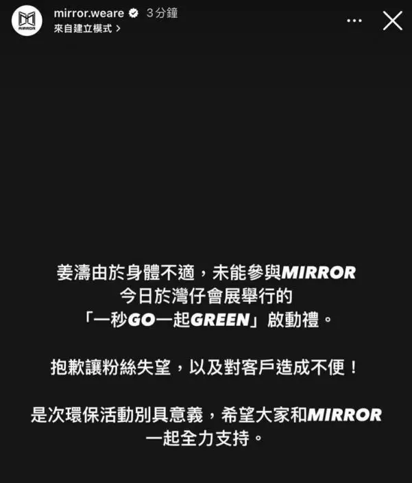 其實MIRROR隊長Lokman在11日被問及姜濤缺席活動一事,已經尷尬地回應:「佢突然之間唔舒服,我都冇辦法!佢尋日做嘢,應該冷親同感冒,費事惹到大家。」對於MIRROR長達3個月未齊人現身都感可惜,並希望姜濤盡快康復。但同場的MIRROR副隊長AK同樣生病,寧打針都照現身活動,難免令網民揣測姜濤可能因其他原因而缺席活動。