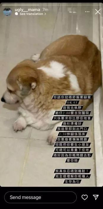 另外有人問雯雯她與張致恒的關係,她說:「其實都冇話有冇好唔好,大家每日角色都係爸爸媽媽,好多嘢唔係單方面,需要睇吓有冇心改變。」看來似乎夫妻關係仍未好轉,不過她在回答另一個問題時,則表示張致恒有幫忙照顧小朋友。之後更有人問到曾自爆患「性上癮」的張致恒的性能力時,雯雯貼出一張狗狗的照片,大方回答說:「你對佢咁有興趣,你應該係佢去instagram。」