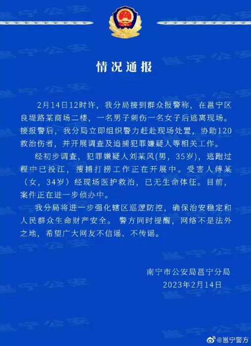 南寧市公安局邕寧分局2月14日發布通報,指2月14日12時許,分局接到群眾報警稱,在邕寧區良堤路某商場二樓,一名男子刺傷一名女子後逃離現場。接報警後,分局立即組織警力趕赴現場處置,協助120救治傷者,並開展調查及追捕犯罪嫌疑人等相關工作。經初步調查,犯罪嫌疑人劉某風(男,35歲),逃跑過程中已投江,搜捕打撈工作正在開展中。受害人傅某 (女,34歲) 經現場醫護救治,已無生命體徵。目前,案件正在進一步偵辦中。