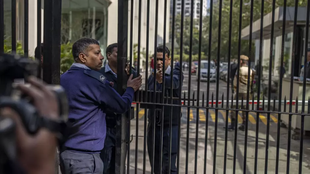 保安關上BBC新德里辦公室的大閘。 美聯社