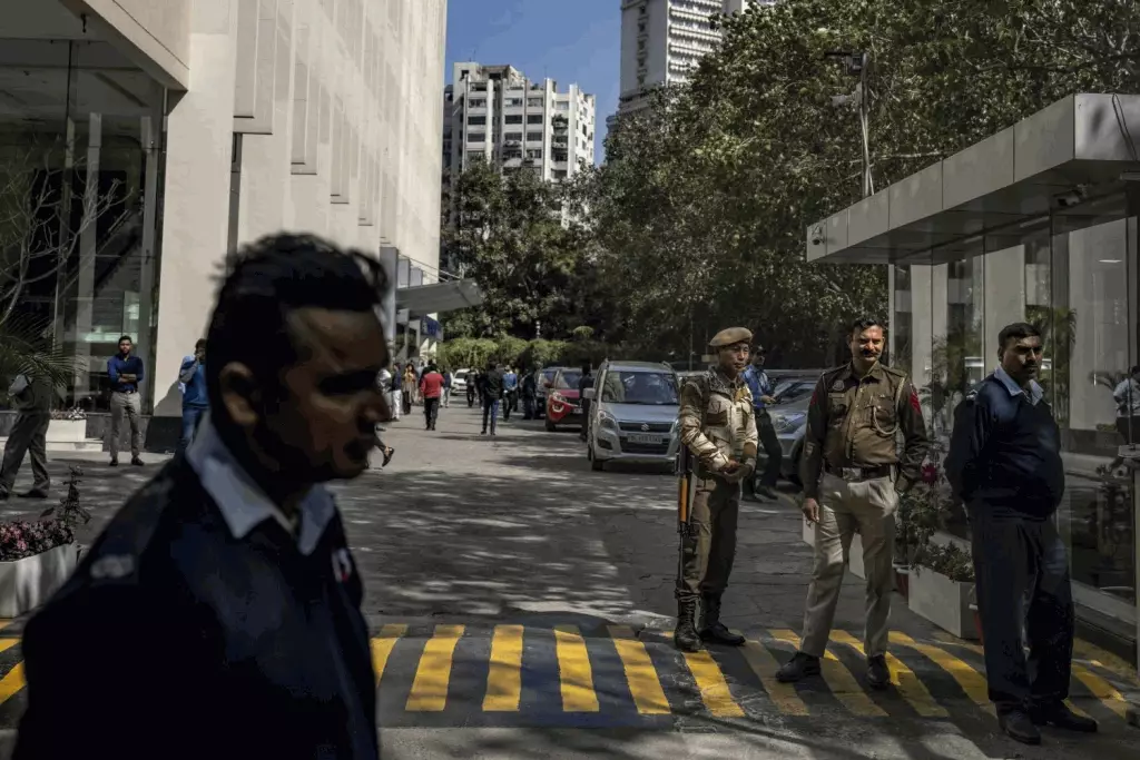 警員及保安聚集在BBC新德里辦公室外。 美聯社