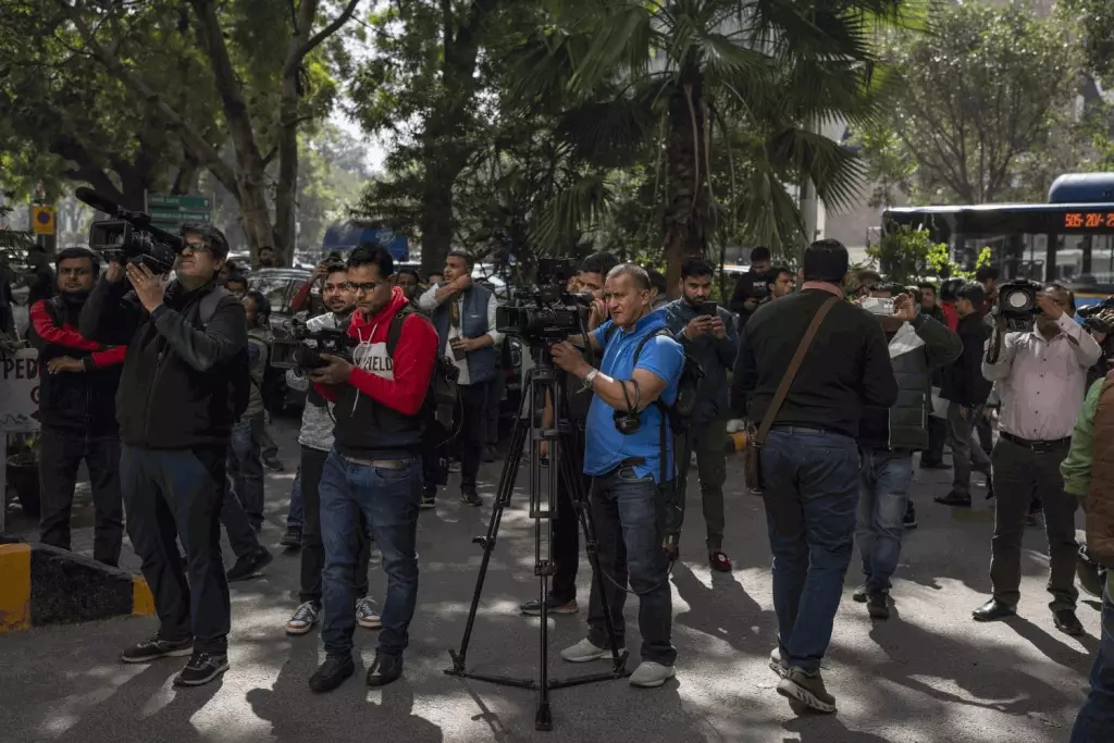 大批傳媒聚集在BBC新德里辦公室外。 美聯社