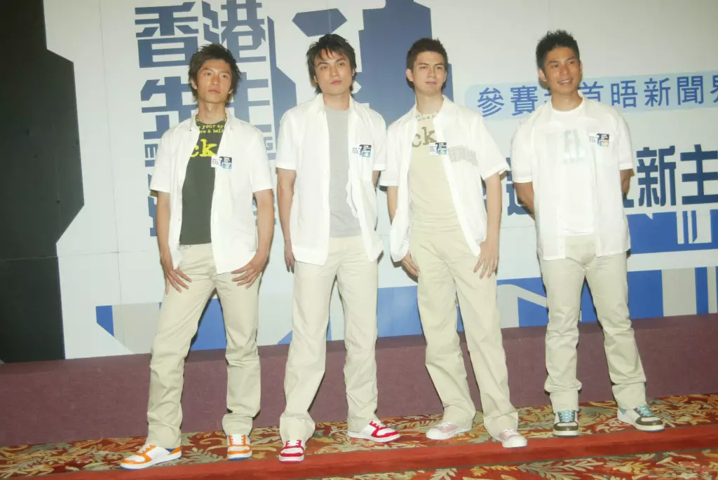 宮雪花兒子江澤龍(右二)在2005年曾參加TVB的《香港先生選舉》。左一為高鈞賢。