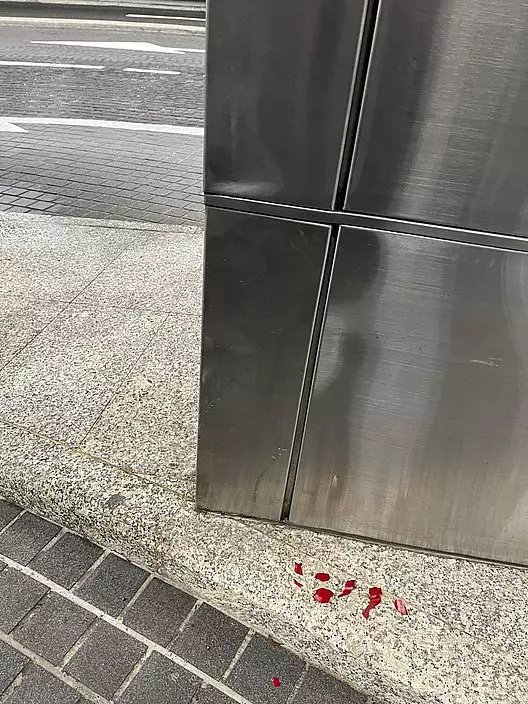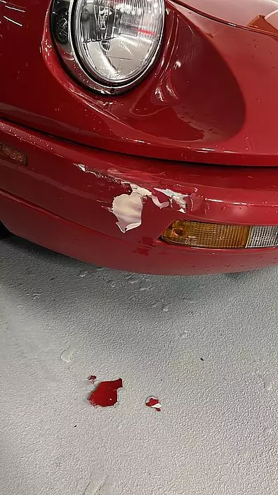 林作的跑車車頭損毀,被撞鐵柱旁遺下跑車甩脫的漆油。 林作提供