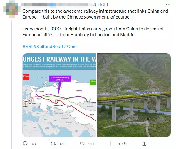 「和中國給歐洲造的鐵路比比看。每個月,1000多列貨運列車將貨物從中國運往幾十個歐洲城市——從漢堡到倫敦和馬德里。」