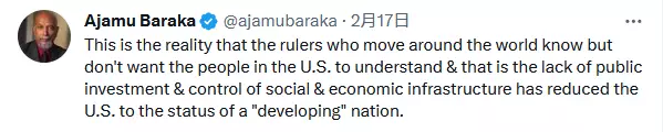 美國人權活動家、政治分析家Ajamu Baraka也就此事發聲。他轉發了一則美國火車在彎曲鐵軌上緩慢危險行駛的視頻,在配文中寫道:「這是所有掌權者都知道,但不希望讓美國人民明白的現實:缺乏公共投資和對社會和經濟基礎設施的控制,已經讓美國淪落到『發展中』國家的地位。」