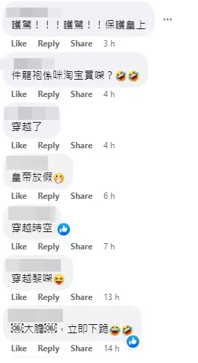 網民對皇上的日常生活相當好奇,問「皇帝都要戴口罩 渣ga」、「唔知佢洗銀兩定洗港幣」、「啲公公呢?」、「年代唔同了,始終馬車比較少,拍卡比較方便」、「九五之尊」、「朝九晚五的專業人士:九五之專」、「件龍袍係咪淘寶買㗎?」。
