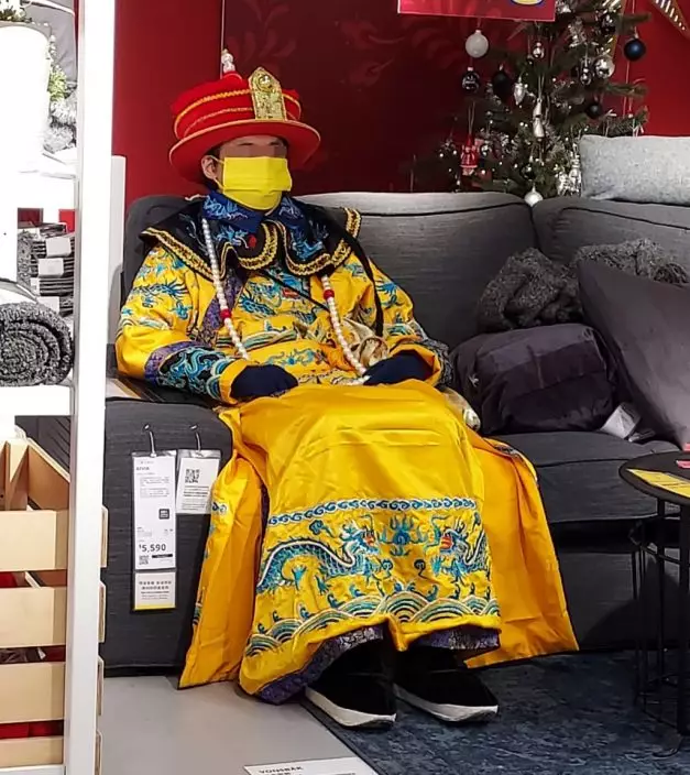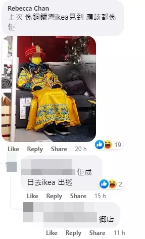 有人上載其他「皇帝」出巡相片,指「上個禮拜先見完」、「有次係銅鑼灣IKEA見到,應該都係佢」,回應的網民指「佢成日去IKEA出巡」,甚至形容銅鑼灣IKEA為「御店」。從網民上載的閃燈相片可見,相中皇上揹著發光背包,網民提醒「重點係佢背囊啲字——好腰好腎絕世好男人」。