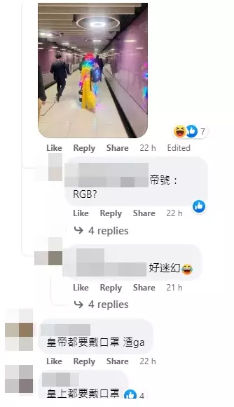 難得見到「皇帝」,網民感嘆「時運高」,並連忙行禮「參見皇上」,有人則笑指樓主「帶蛋鵰文,仲唔落車護駕」、「大膽 ,立即下跪」、「護駕!!!護駕!!保護皇上」、「又唔下跪又唔護駕,無禮」,甚至代皇上傳話:「同朕check下去天后要坐幾多個站」、「快d幫朕check吓下一班車幾時到!?」、「坐咗半日時光機都攰,朕返酒店稍為休息」。