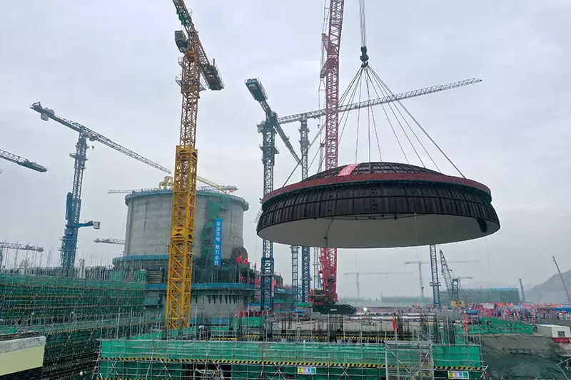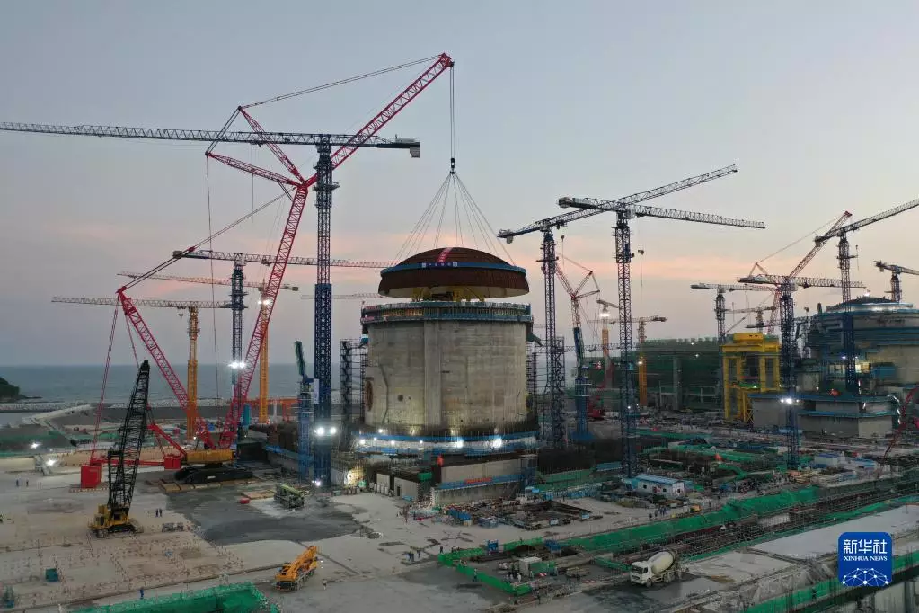 廣東太平嶺核電1號機組完成穹頂吊裝施工現場。新華社