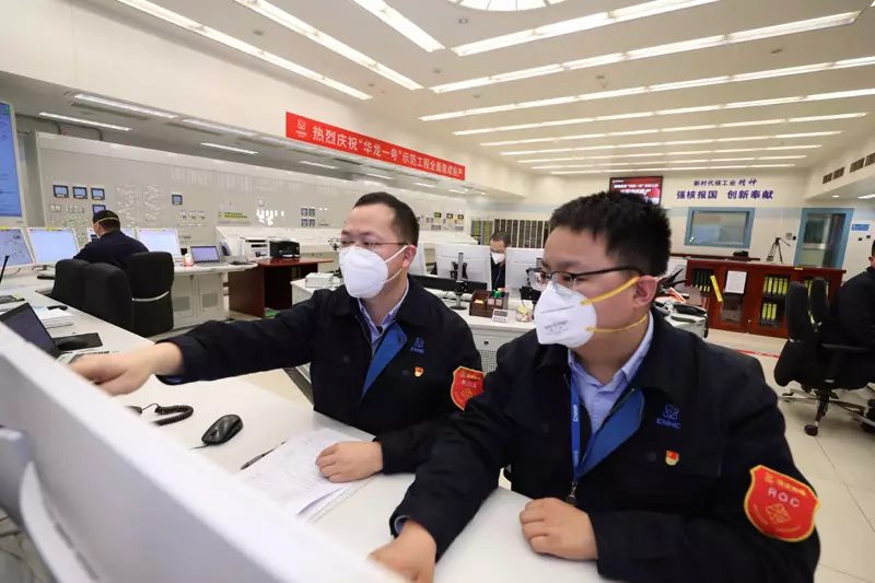 工作人員在「華龍一號」示範工程福清核電6號機組主控室工作。新華社