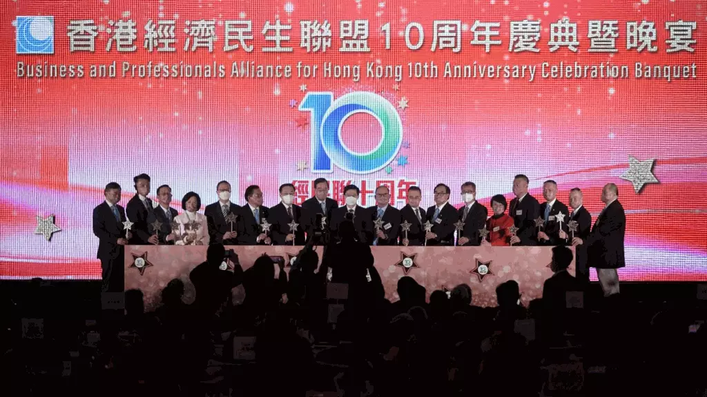 經民聯20日晚舉行成立10周年慶典暨晚宴,現場冠蓋雲集,行政長官李家超、中聯辦副主任何靖、外交部駐港特派員公署特派員劉光源、財政司司長陳茂波、律政司司長林定國、立法會主席梁君彥、行政會議召集人葉劉淑儀、旭日國際集團主席蔡志明等人出席。