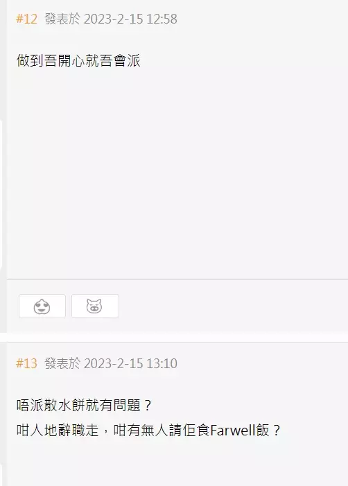 另有打工仔引述自我經驗稱,「我今日last day都沒派。同樣地,他們也沒有farewell lunch。我一早已經同佢地講唔要大搞。大家都係打份工。打工係為錢。何必為了形式而大費金錢?」