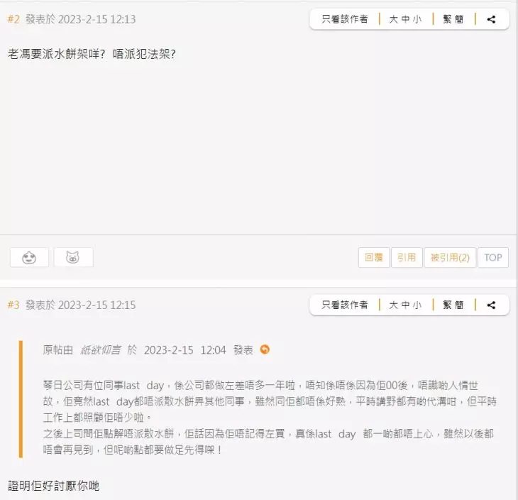 有網民以「同事last day竟然唔派散水餅」為題發牢騷。網上截圖