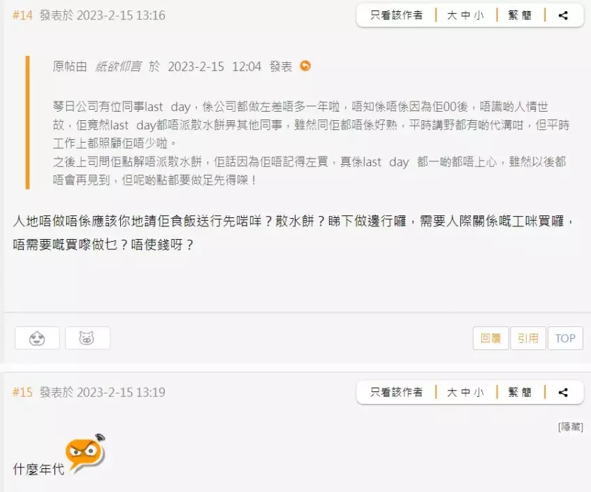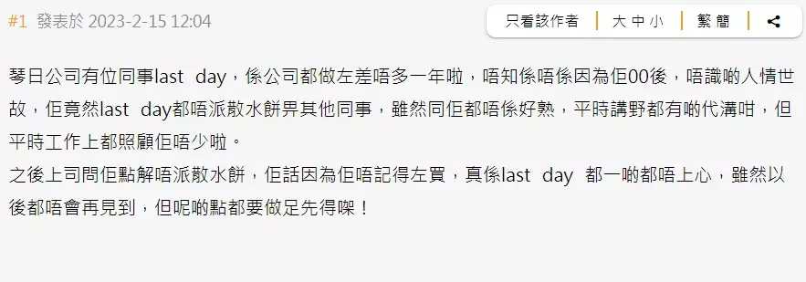 樓主指「公司有位同事last day,係公司都做咗差唔多一年啦,唔知係唔係因為佢00後,唔識啲人情世故,佢竟然last day都唔派散水餅畀其他同事,雖然同佢都唔係好熟,平時講嘢都有啲代溝咁,但平時工作上都照顧佢唔少啦。之後上司問佢點解唔派散水餅,佢話因為唔記得咗買,真係last day都一啲都唔上心,雖然以後都唔會再見到,但呢啲點都要做足先得㗎!」。