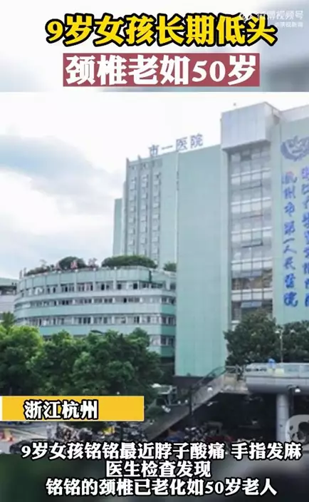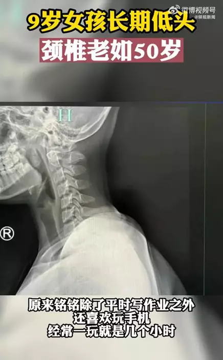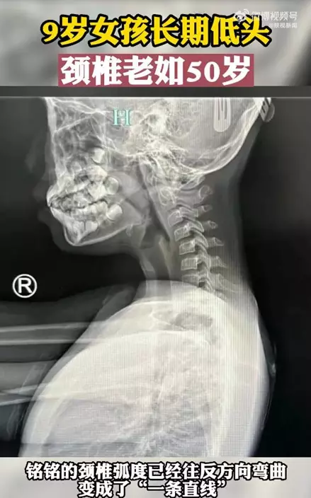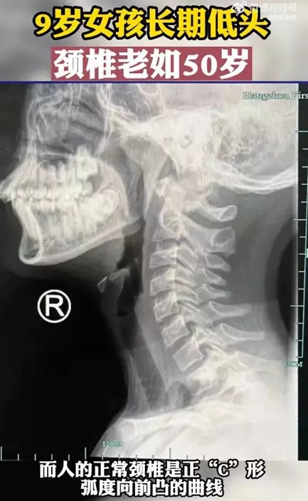 浙江杭州一名9歲女孩銘銘最近常出現脖子酸痛、手指發麻等症狀。醫生檢查後發現她的頸椎已老化如50歲長者,人的正常頸椎是呈正「C」形,而女童的頸椎弧度往反方向彎曲變成「一條直線」。原來,銘銘除了平時寫功課外,還沉迷於玩手機,經常一玩就是幾個小時,因此導致了嚴重的脊椎病,醫生藉此提醒各位家長,一定要關注子女的脊椎健康問題。