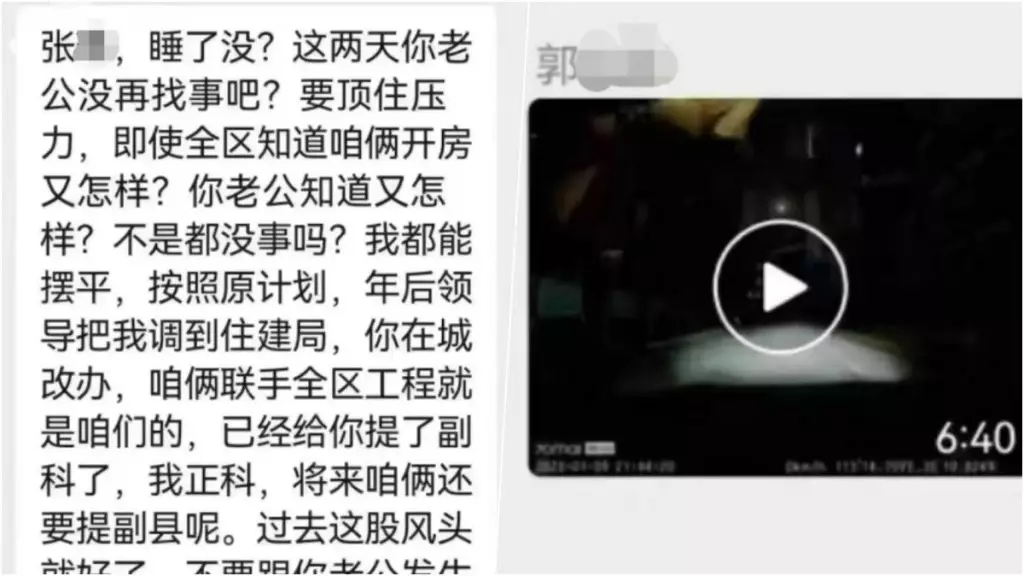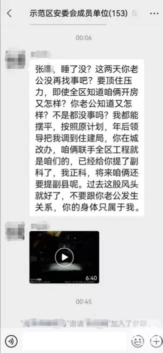從這段信息可以看出,張某或已婚,其與郭某某疑似有不正常男女關係。郭某某那句「咱倆聯手全區工程就是咱們的」,更讓很多人驚掉下巴。聊天記錄顯示郭某某還發了一段影片,但相關影片未能觀看。