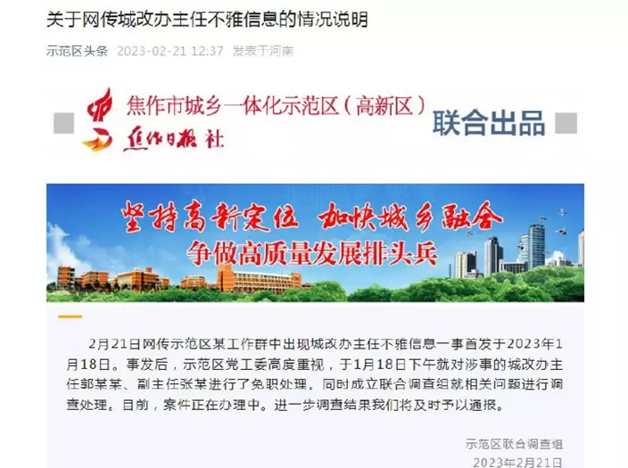 大皖新聞報道,2月17日下午,記者向焦作市城鄉一體化示範區城改辦查詢時問「郭主任」在不在,一位工作人員回覆指,其已經調崗,但並未透露具體的去向。2月21日,記者聯繫焦作市城鄉一體化示範區宣傳部,一位工作人員表示,事件正在調查中,並未透露更多情況。