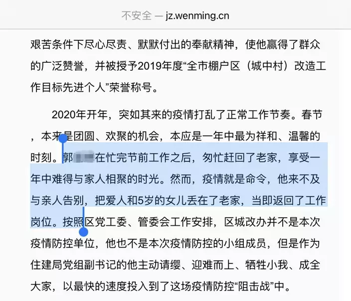 大皖新聞又指,在微信公眾號「文明焦作」上,2020年6月還曾在一個名叫「德耀懷川 · 身邊好人」的欄目中宣傳了郭某某,其中介紹,2018年他曾在此前工作的單位中「突然眼前一黑,一頭栽在地上」,後被查出患有腦動脈瘤,手術後腦血管中放入了支架。2019年4月調任區城改辦。2020年開年,疫情發生後,那個春節,「他來不及與親人告別,把愛人和5歲的女兒丟在了老家,當即返回了工作崗位。」