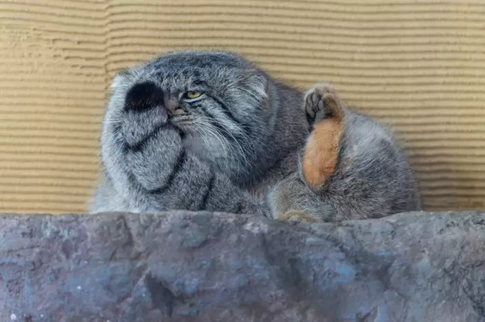近日,推主前往了位於北海道旭川的旭山動物園,觀察兔猻時卻發現牠縮在角落,一隻腳高高翹起,接著竟用粗壯的尾巴先遮住右眼,再遮住左眼。