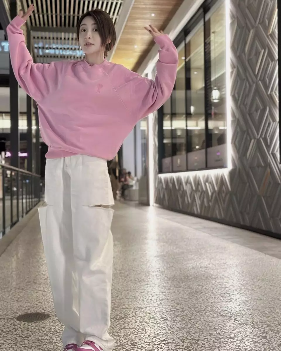 薇薇今次將長髮束成個性短髮,看起來清爽很多。她又穿上粉紅風的衛衣和白色鬆身長褲,雖然將曼妙身材完全遮蓋住,但衣服揀對顏色讓她氣色看起來仍然很好。她平時又注重保養,皮膚白滑不見皺紋,加上她可愛活潑的舉止,整個人瞬間回春充滿少女味!
