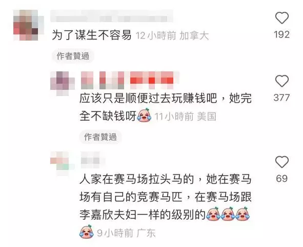 對於有網民質疑米雪「為了謀生不容易」,粉絲紛紛群起反駁:「應該只是順便過去玩賺錢吧,她完全不缺錢呀!」、「可能她去表演不是為了錢,而是為了喜歡她的粉絲能見到她。」還有人提到米雪多次在馬場拉頭馬:「人家在賽馬場拉頭馬的,她在賽馬場有自己的競賽馬匹,在賽馬場跟李嘉欣夫婦一樣的級別的。」米雪目前個人名下有愛駒「蟲草成名」,上個賽季「蟲草成名」戰爭標彪,出戰9場贏得5次頭馬,雖然今年升班後賽績平平,但跟據馬會資料,「蟲草成名」自2021年4月首度參賽後,已為米雪贏得逾1,104萬元獎金!