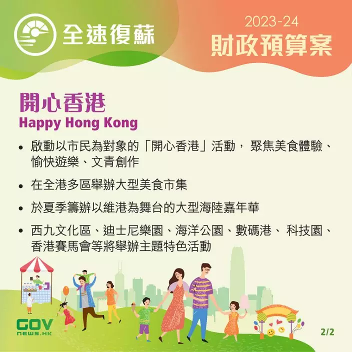 財政司司長陳茂波周三(22日)公布新一份財政預算案。除了預留一億元吸引遊客和爭取大型盛事來港舉行之外,還啟動以本港市民為對象的「開心香港」(Happy Hong Kong)活動。