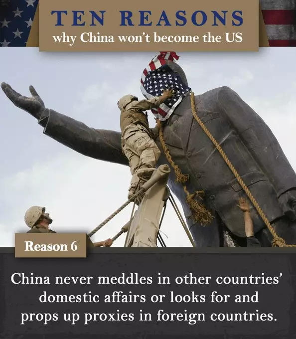 原因六:中國從不干涉別國內政,從不在國外尋找和扶植代理人。