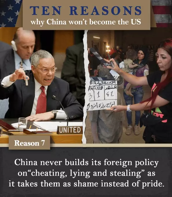 原因七:中國從來不把外交政策建立在「欺騙、謊言和偷竊」上,因為中國把這些視為恥辱,而不是驕傲。