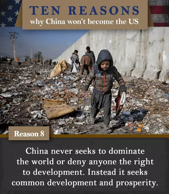 原因八:中國從不稱霸世界,不剝奪任何國家(地區)的發展權。相反,中國謀求共同發展和繁榮。