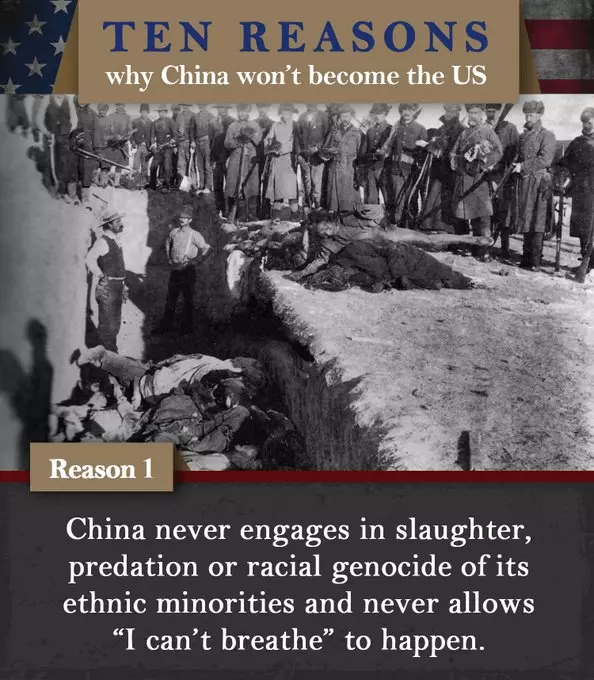 原因一:中國從來不對少數民族進行屠殺、掠奪和種族滅絕,從來不允許發生「我無法呼吸」事件。