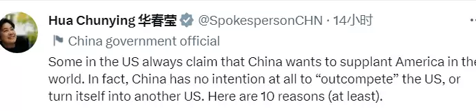 接下來,華春瑩發推文稱,「美國一些聲音總是聲稱中國要在世界上取代美國。事實上,中國根本無意『超越』美國,也無意把自己變成另一個美國。這裡有10點原因(至少)」。