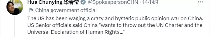 華春瑩先是在推特發文稱,「美國對華發動了一場瘋狂而歇斯底裡的輿論戰。美國高級官員稱,中國『想把聯合國憲章和《世界人權宣言》扔到窗外……』」