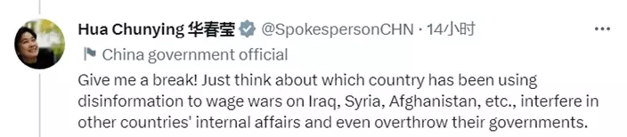 「別逗了!想想是哪個國家在利用虛假信息對伊拉克、敘利亞、阿富汗等國家發動戰爭,干涉別國內政,甚至推翻別國政府。」華春接著發推文稱。