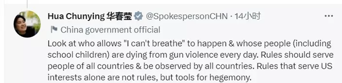 她繼續表示,「看看是誰允許『我無法呼吸』事件發生,是誰的人民(包括學生)每天都死於槍支暴力。規則應該為各國人民服務,為各國所遵守。僅為美國利益服務的規則不是規則,而是霸權工具。」
