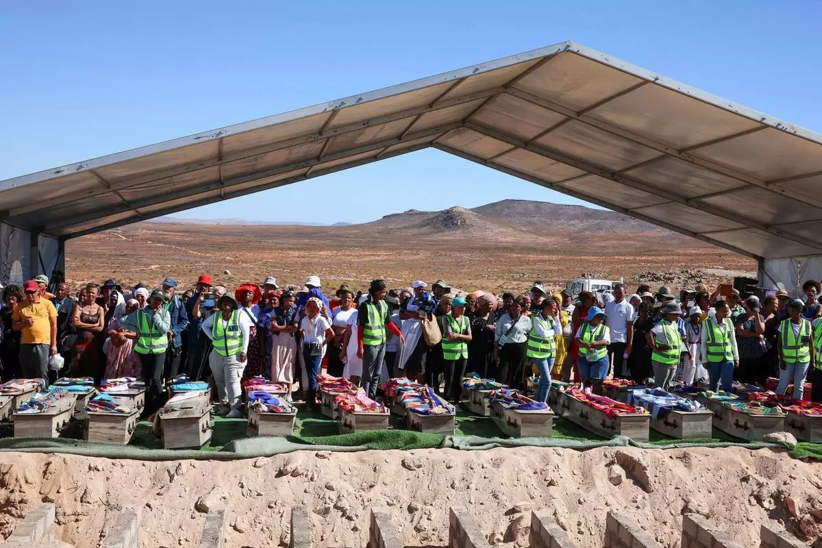 南非政府通訊及資訊服務處提供的照片顯示,2026年3月23日周一,在南非斯泰因科普夫(Steinkopf),家人和社區成員在重新安葬數十具非洲人遺骸的儀式上站在棺木後方。這些遺骸早年被挖掘並運往歐洲作科學研究。(賈魯斯·穆特爾/南非政府通訊及資訊服務處 via 美聯社) AP圖片