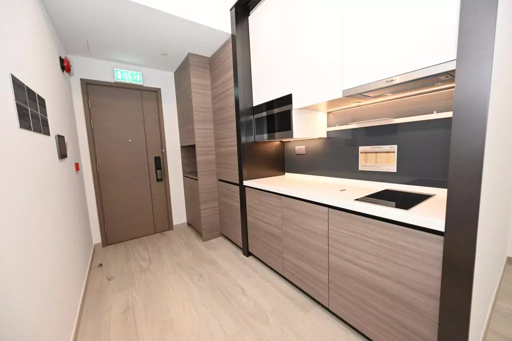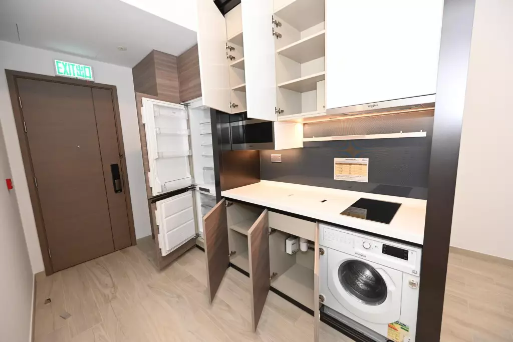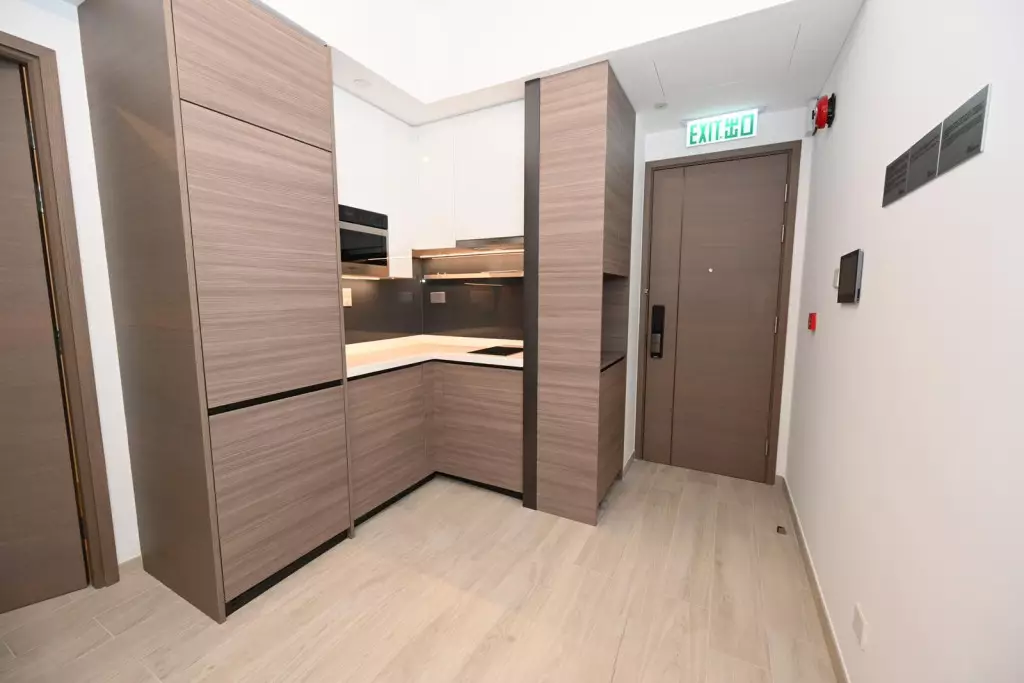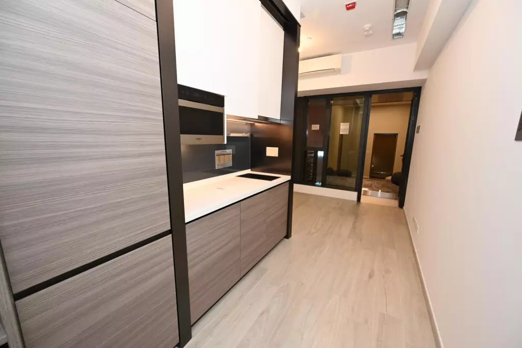 而18樓E室,面積340方呎,屬1房開放式廚房設計,廚房設有入牆式廚櫃,收納空間充裕,同時配備各式名廠家電,用料講究,各式煮食用具齊備。