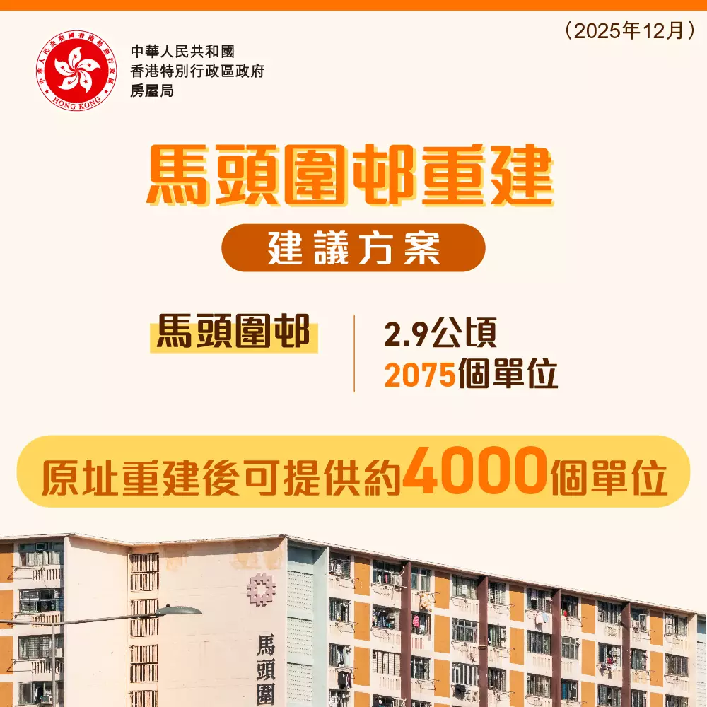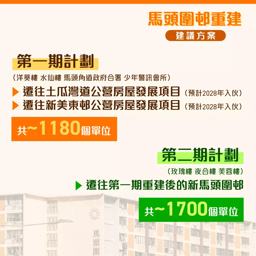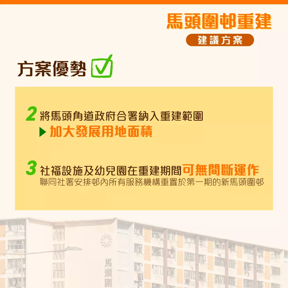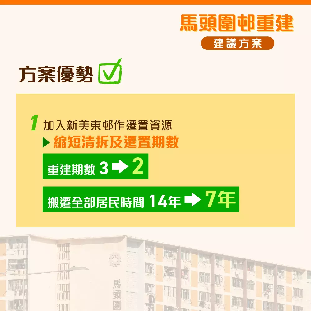 何指出,在馬頭圍邨方面,原本2075個單位的屋邨,重建後單位數量可以達到約4000個單位,近乎翻倍。為加速進度及善用土地,當局經考慮後,建議在土瓜灣道公營房屋發展項目以外,將部分新美東邨公營房屋發展項目加入用作遷置資源,令3期的重建期數縮短至2期,而搬遷全部居民的時間亦由14年大幅縮減至7年;將馬頭角道政府合署納入重建範圍,以加大發展用地面積;及在重建期間維持社福設施及幼兒園無間斷運作。