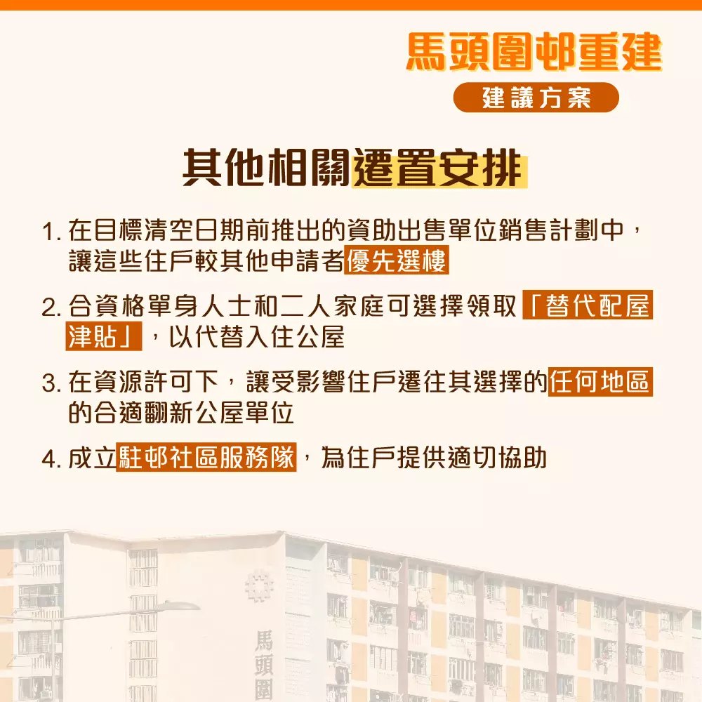 何強調,每個重建項目房署都會仔細考慮屋邨特色,在重現社區回憶的同時,也善用資源,爭取服務更多市民。當局也建議成立駐邨社區服務隊,為受影響住戶提供適切協助。有關重建建議方案,有待房委會通過並正式宣布落實,當局會持續與社區溝通交流,與大家一起「重薈馬頭圍」、「再聚梯臺」。
