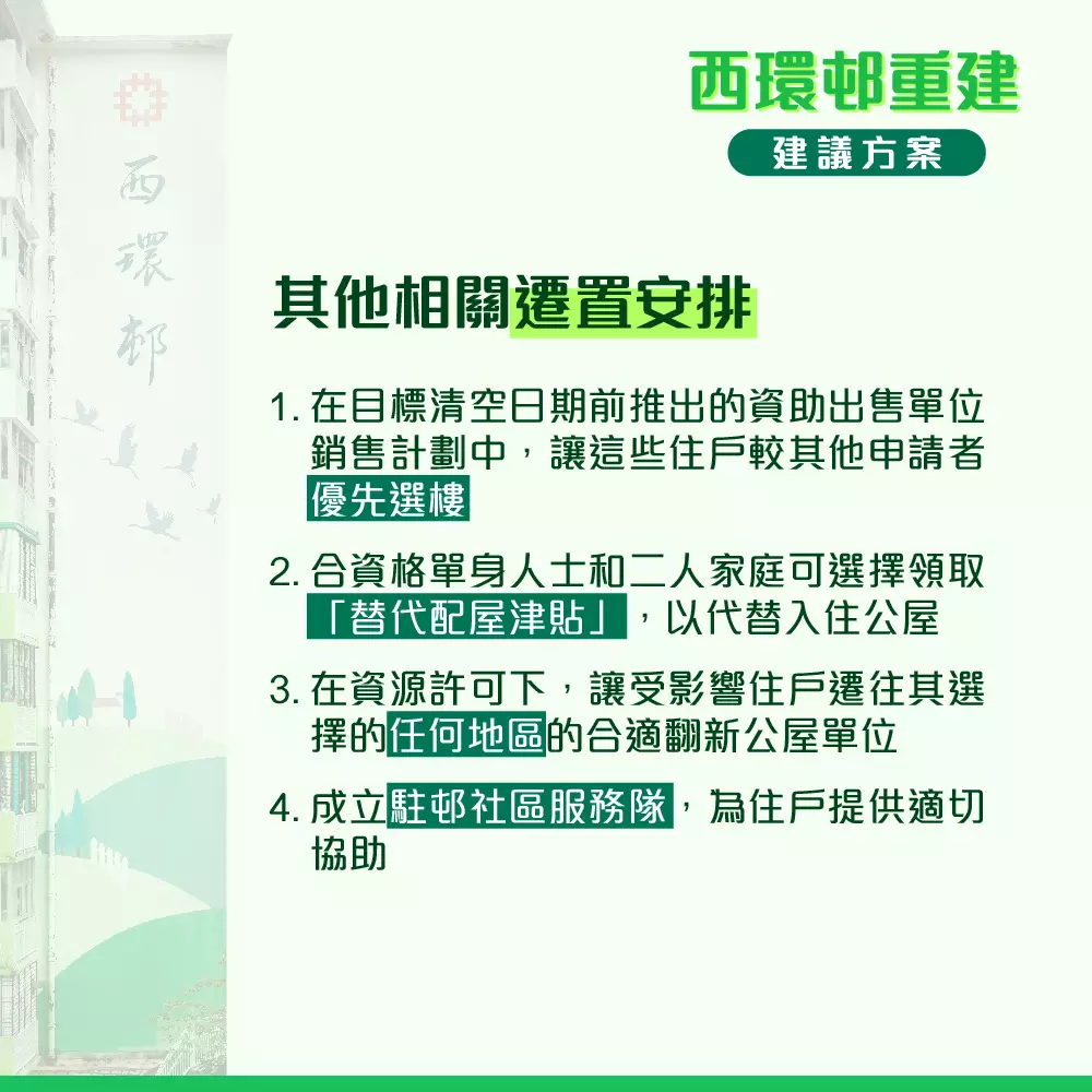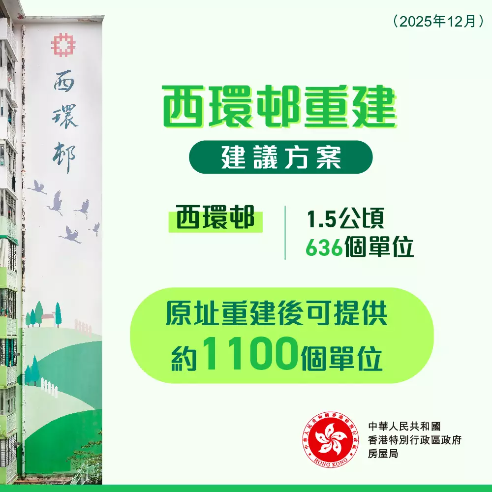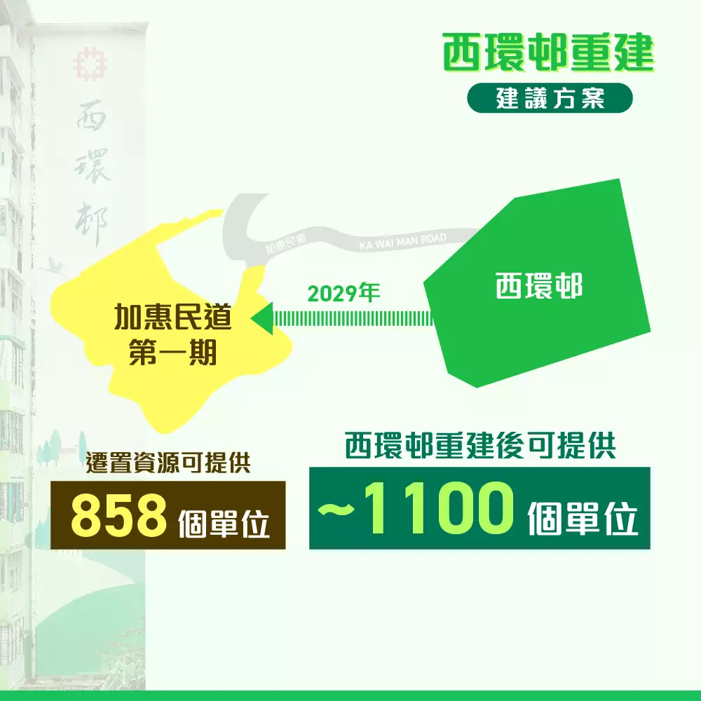 至於西環邨方面,原本636個單位的屋邨,重建後單位數量可增加逾70%至約1100個單位。受影響的住戶可全數遷至加惠民道第一期公屋單位,預計可於2029年入伙。