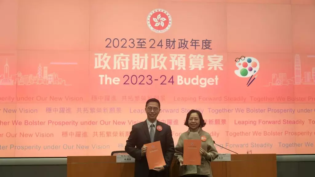 財政預算案中其政策範疇的相關措施記者會。文化體育及旅遊局局長楊潤雄(左)和民政及青年事務局局長麥美娟(右)