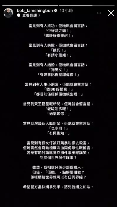林盛斌深夜出Po痛斥網民極度冷血。