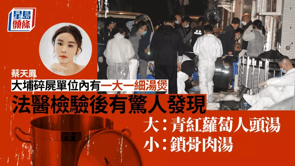 大埔龍尾村肢解烹屍案中,28歲時裝名媛蔡天鳳(Abby Choi),尋覓多時的頭顱終於發現下落。消息指,西九龍總區重案組探員周五(24日)在龍尾村搜索後撿獲多箱證物,其中在屋內撿獲的一大一細湯煲,消息指探員密封帶回化驗所詳細化驗,終證實兩個煲內的湯骨皆含有人肉及人骨成份。