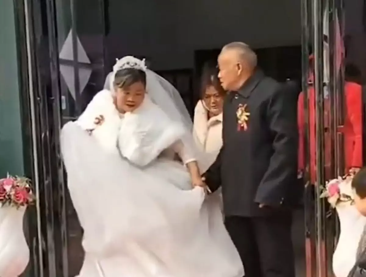 老翁拖著新娘的手步出。