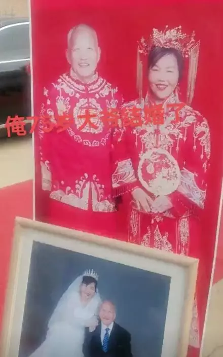 婚禮現場擺放著老翁和新娘甜蜜的結婚照。
